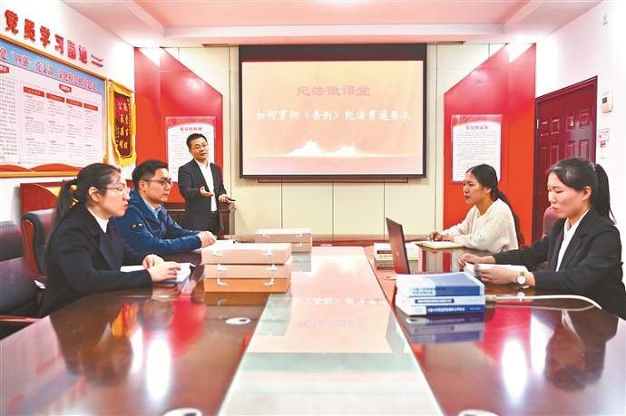 江西省新余市紀(jì)委監(jiān)委不斷強(qiáng)化紀(jì)檢監(jiān)察干部對執(zhí)紀(jì)執(zhí)法貫通理念的理解運(yùn)用,建立“通報(bào)講評”機(jī)制,針對實(shí)踐中發(fā)現(xiàn)的難點(diǎn)問題及時(shí)分析講解,提升案件辦理質(zhì)效。圖為該市紀(jì)委監(jiān)委案件審理室圍繞新修訂的紀(jì)律處分條例,解讀紀(jì)法銜接條款的理解運(yùn)用。黃磊 攝