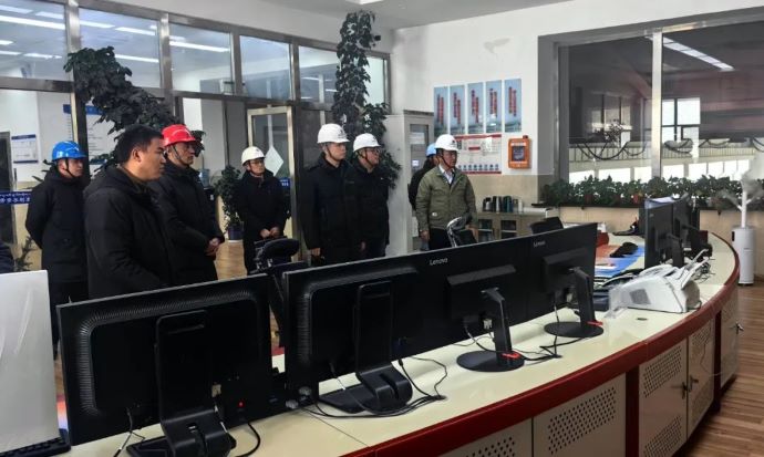 劉剛(右四)在電站中控室了解生產(chǎn)運(yùn)行情況。