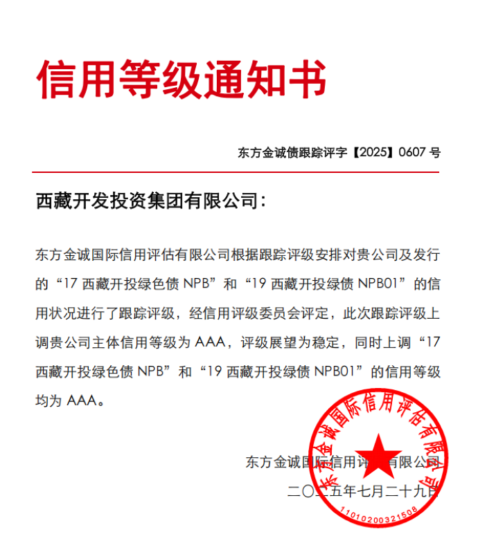 7月29日,經(jīng)國內(nèi)權(quán)威信用評級機構(gòu)(東方金誠國際信用評估有限公司)評審認定,西藏開發(fā)投資集團有限公司(以下簡稱“西藏開投集團”)獲評AAA主體信用等級,評級展望為“穩(wěn)定”,成為自治區(qū)第一家國有AAA企業(yè),標(biāo)志著自治區(qū)成功培育出首家本地主體信用等級AAA企業(yè),填補了我區(qū)最高等級國有信用主體的空白。