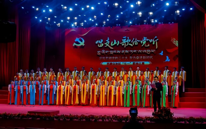 “朋友!你到過黃河嗎?你渡過黃河嗎?你還記得河上的船夫拼著性命和驚濤駭浪搏戰(zhàn)的情景嗎?如果你已經(jīng)忘掉的話,那么你聽吧!”由58人組成的西藏開投集團(tuán)參賽隊(duì)以一曲《保衛(wèi)黃河》,唱響了黨領(lǐng)導(dǎo)全國人民走過的風(fēng)雨歷程,唱出了戰(zhàn)勝敵人、奪取勝利的激情。