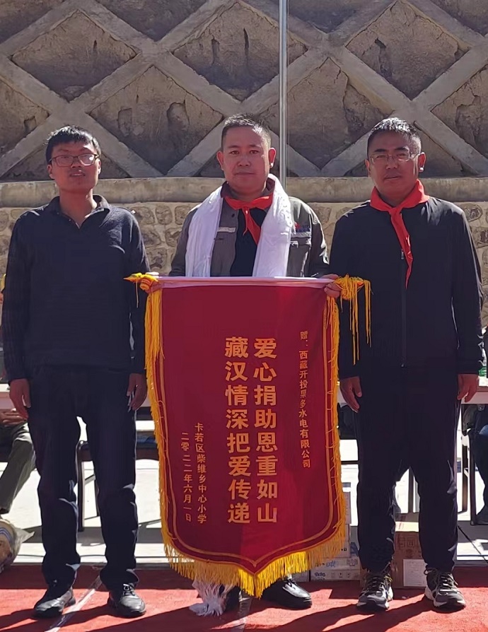 果多水電公司代表張二林同志作了題為“祖國的未來,民族的希望”的講話,并代表果多水電公司給學(xué)校捐贈了學(xué)習(xí)用品,足球、排球、羽毛球等,勉勵孩子們要樹立遠(yuǎn)大理想,努力學(xué)習(xí),健康成長,以優(yōu)異的成績回報社會、回報祖國。柴維鄉(xiāng)小學(xué)贈送了“愛心捐助恩重如山,藏漢情深把愛傳遞”的錦旗,感謝果多水電公司對學(xué)校的關(guān)心支持幫助。
