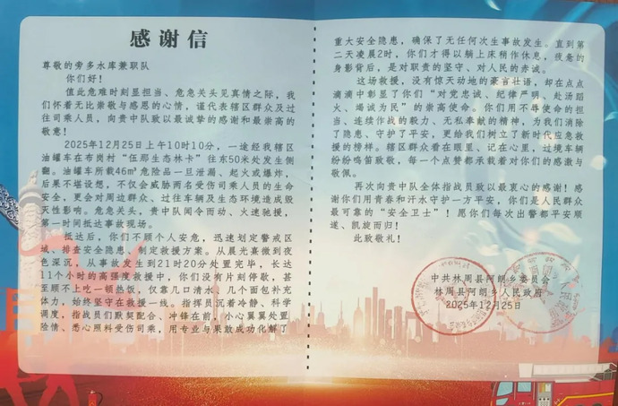 近日,西藏開投旁多水電公司兼職消防隊獲林周縣阿朗鄉(xiāng)黨委、政府授予的錦旗與感謝信,表彰其在一起?;愤\輸車輛側(cè)翻事故救援中的突出貢獻(xiàn)。