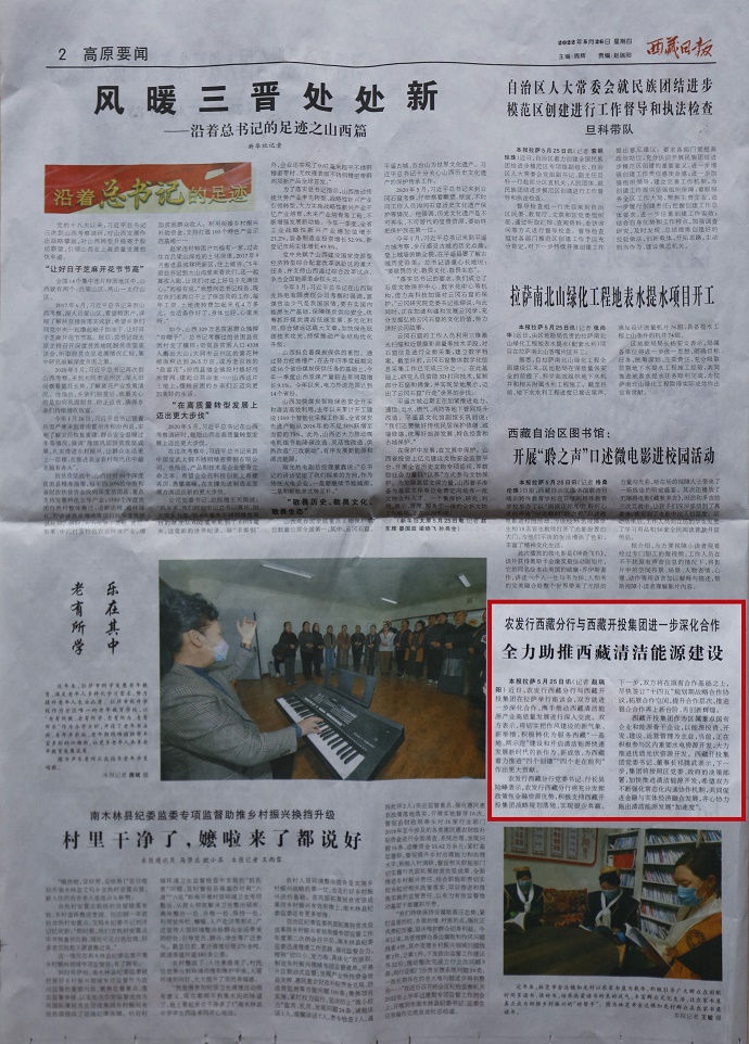 (編者按)《西藏日報》2022年5月26日在第2版“高原要聞”欄目刊登文章,報道集團公司與農(nóng)發(fā)行西藏分行銀企攜手全力助推西藏清潔能源建設(shè)。全文如下: