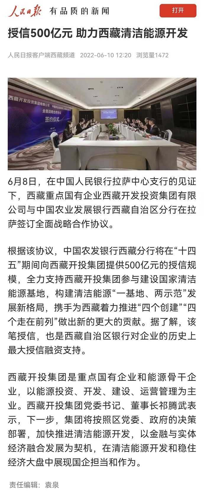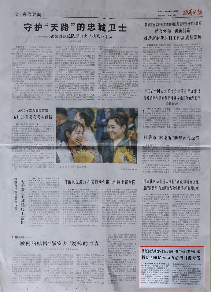 ?。ň幷甙矗?月10日,《人民日報》客戶端西藏頻道報道了《授信500億元 助力西藏清潔能源開發(fā)》?!段鞑厝請蟆?022年6月10日在第2版“高原要聞”欄目刊登文章,報道《授信500億元|西藏開投集團與中國農(nóng)發(fā)行西藏分行簽訂全面戰(zhàn)略合作協(xié)議》。西藏電視臺2022年6月10日在西藏電視臺影視文化頻道《今晚九點》欄目報道了《授信500億元|西藏開投集團與中國農(nóng)發(fā)行西藏分行簽訂全面戰(zhàn)略合作協(xié)議》,《珠峰云》平臺同步播放。新華網(wǎng)、經(jīng)濟日報、西藏衛(wèi)視、西藏日報客戶端、網(wǎng)信西藏、今日頭條等媒體均報道了相關新聞。全文如下: