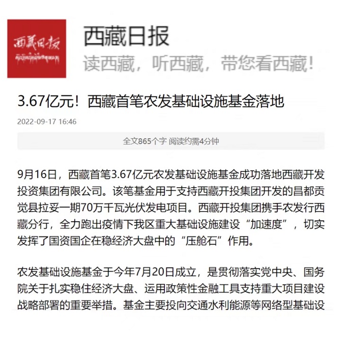 (編者按)《西藏日報》2022年9月17日報道西藏首筆農發(fā)基礎設施基金落地西藏開投集團。全文如下: