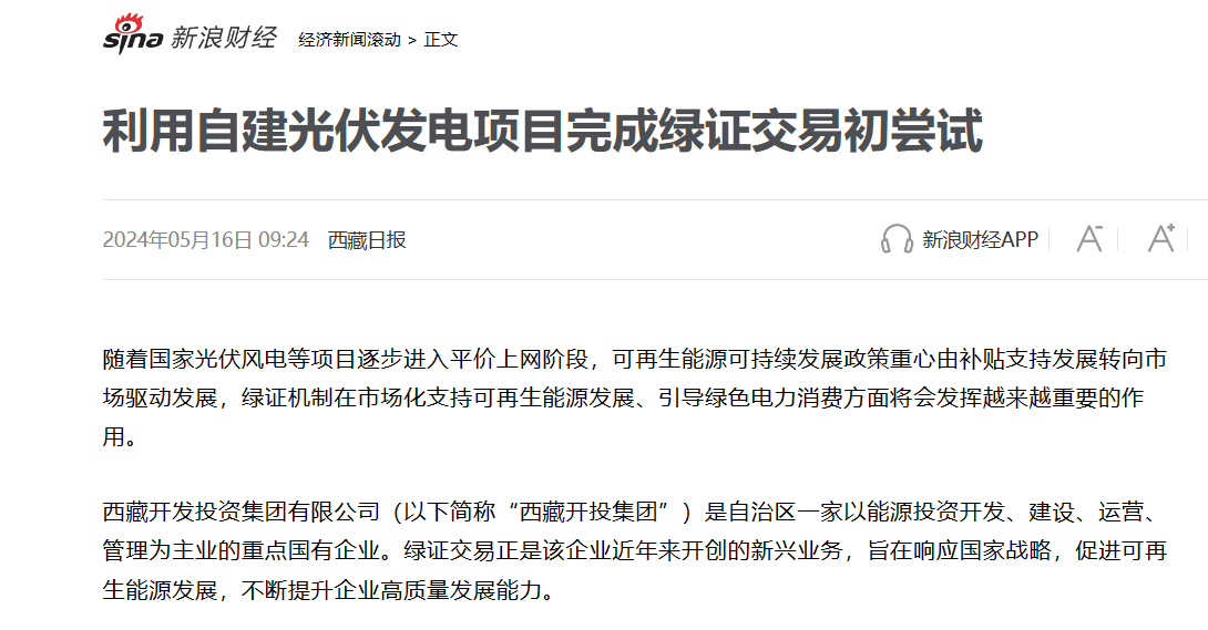 西藏日報、新浪財經(jīng)等媒體報道利用自建光伏發(fā)電項目完成綠證交易初嘗試
