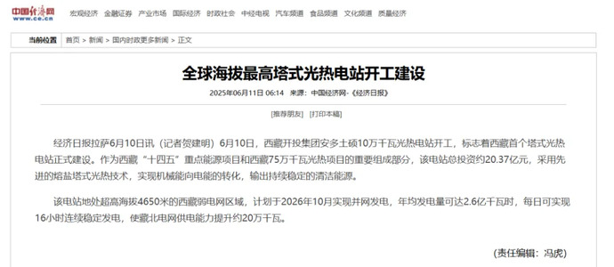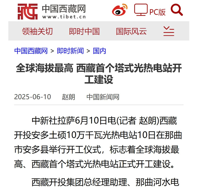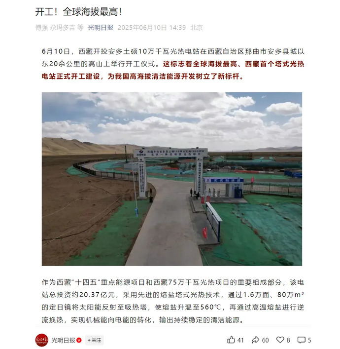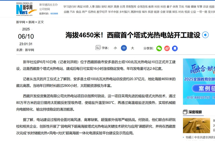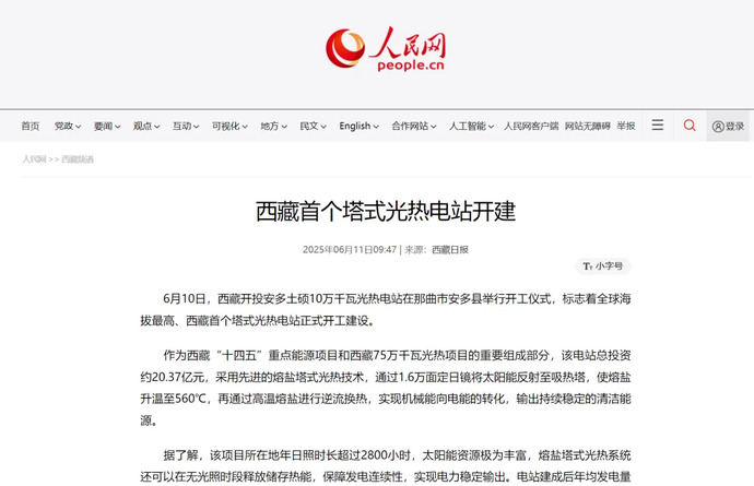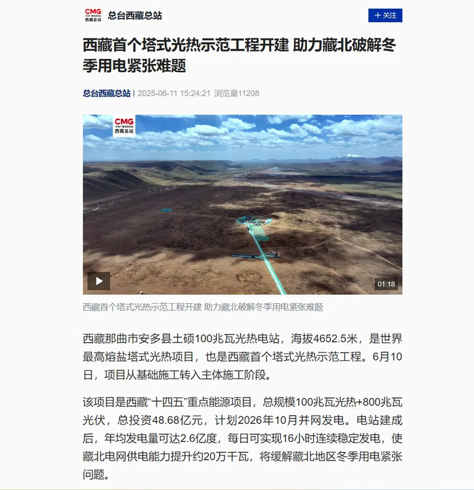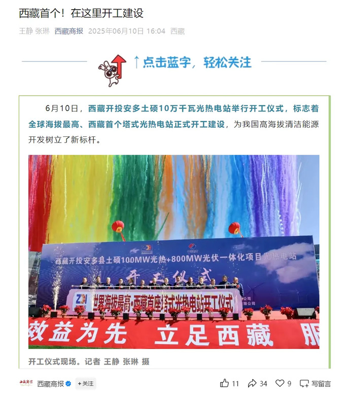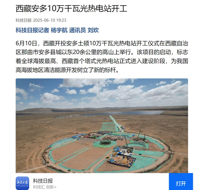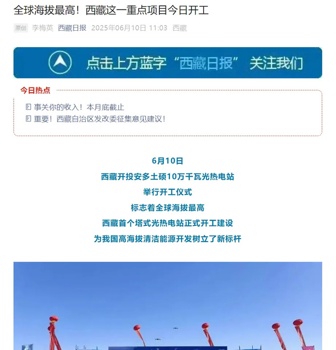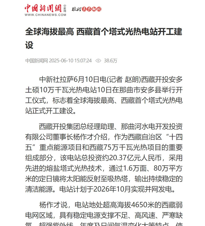 媒體報道丨全球海拔最高、西藏首個塔式光熱電站開工建設