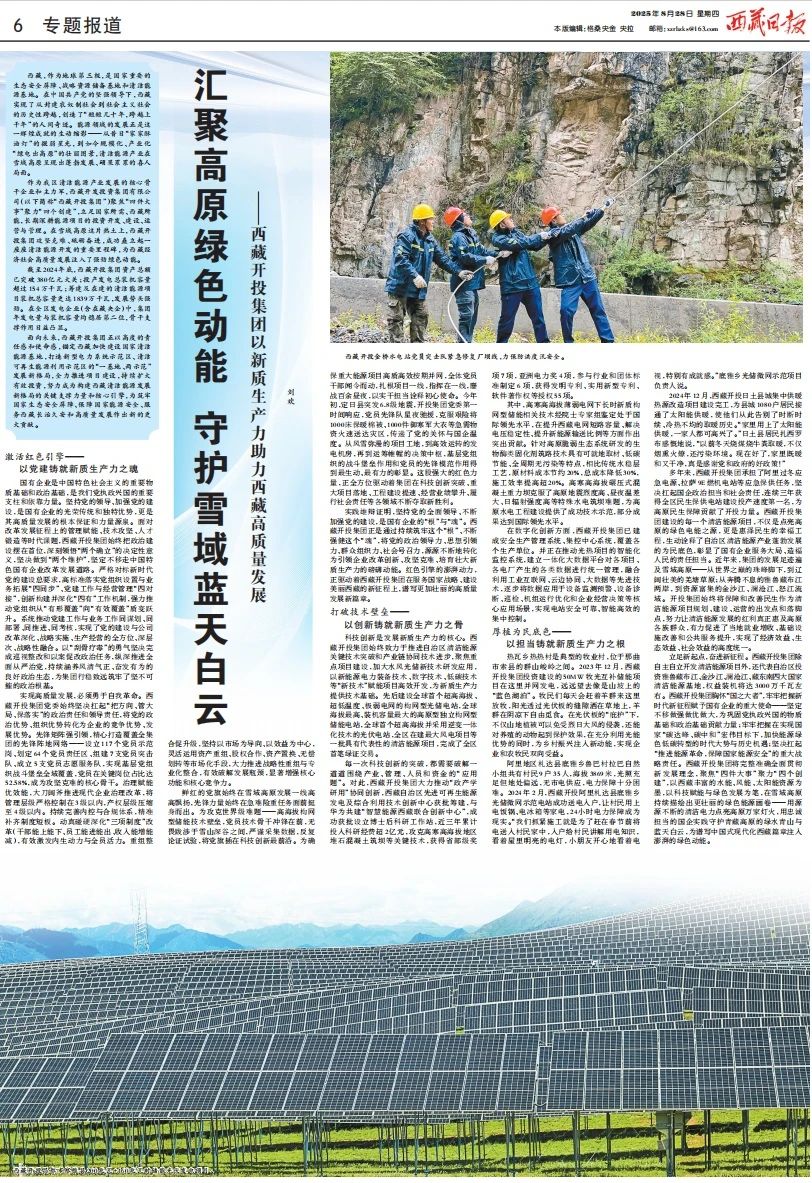 8月28日,《西藏日報》以題為《匯聚高原綠色動能 守護雪域藍天白云——西藏開投集團以新質(zhì)生產(chǎn)力助力西藏高質(zhì)量發(fā)展》的整版文章,專題報道了西藏開投集團近年來致力國企改革、發(fā)展新質(zhì)生產(chǎn)力,推動西藏清潔能源產(chǎn)業(yè)高質(zhì)量發(fā)展的階段性成績。一起來看詳細報道↓↓↓。