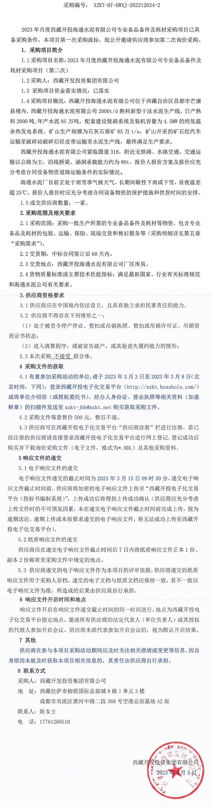 2023年月度西藏開投海通水泥有限公司專業(yè)備品備件及耗材采購項(xiàng)目詢價采購公告