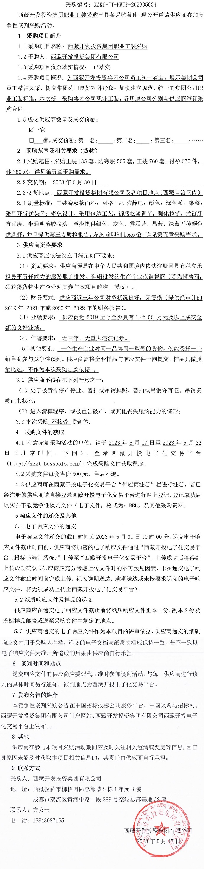 西藏開發(fā)投資集團職業(yè)工裝采購競爭性談判采購公告