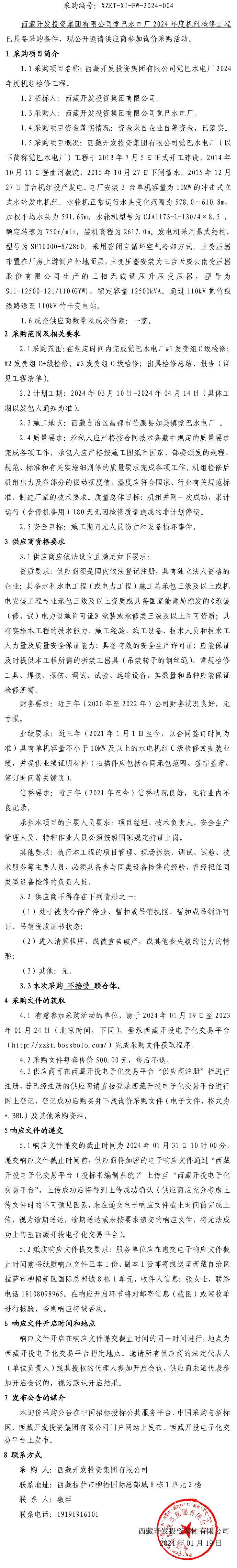西藏開發(fā)投資集團有限公司覺巴水電廠2024年度機組檢修工程詢價采購公告