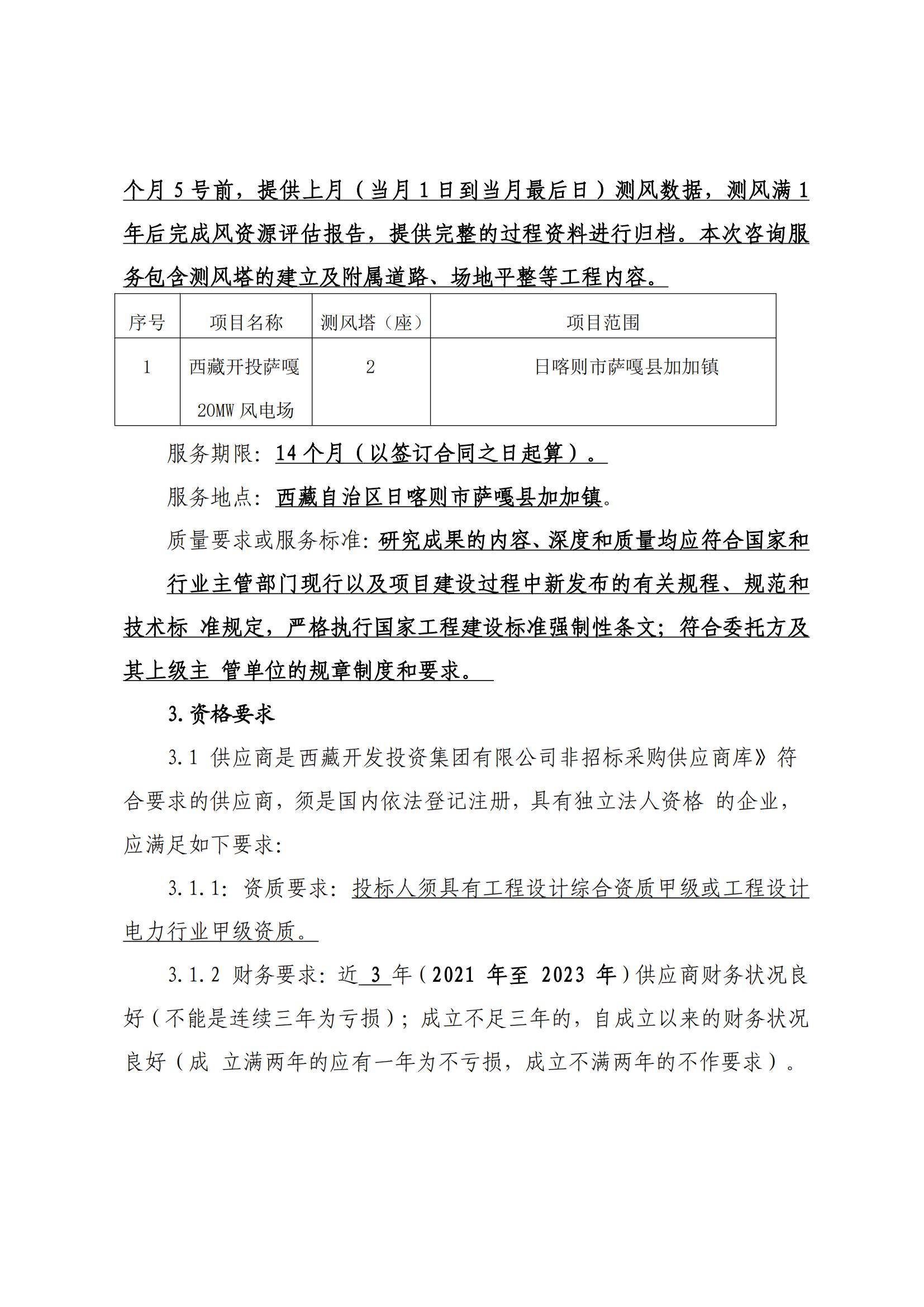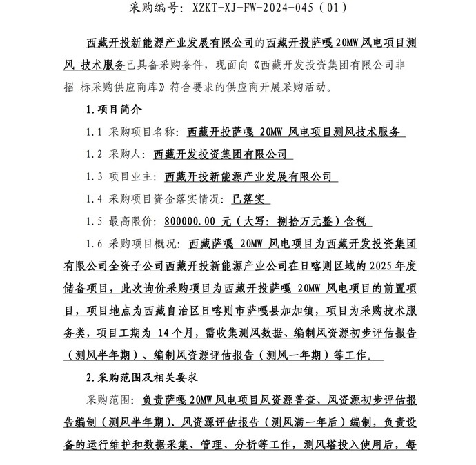 西藏開投薩嘎20ML風電項目測風技術服務詢價采購公告(第二次)