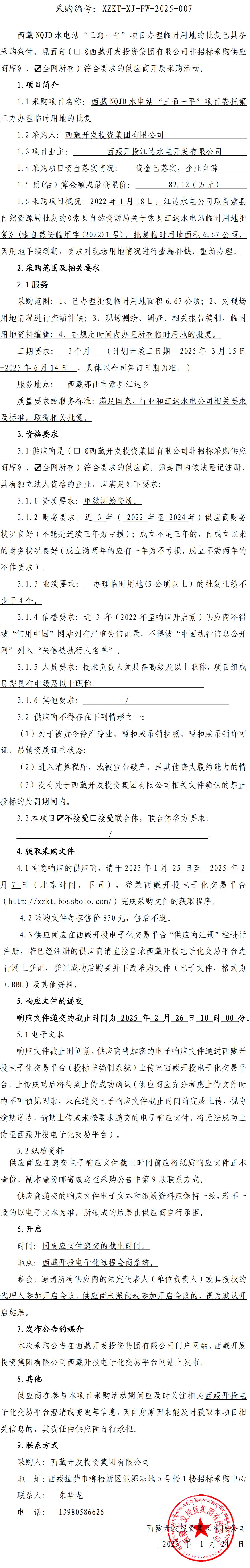 西藏NQJD水電站“三通一平”項(xiàng)目辦理臨時(shí)用地的批復(fù)詢價(jià)采購公告