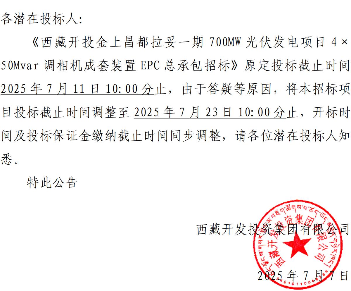 關(guān)于延長《西藏開投金上昌都拉妥一期700MW光伏發(fā)電項(xiàng)目4×50Mvar調(diào)相機(jī)成套裝置EPC總承包招標(biāo)》投標(biāo)截止時(shí)間的公告