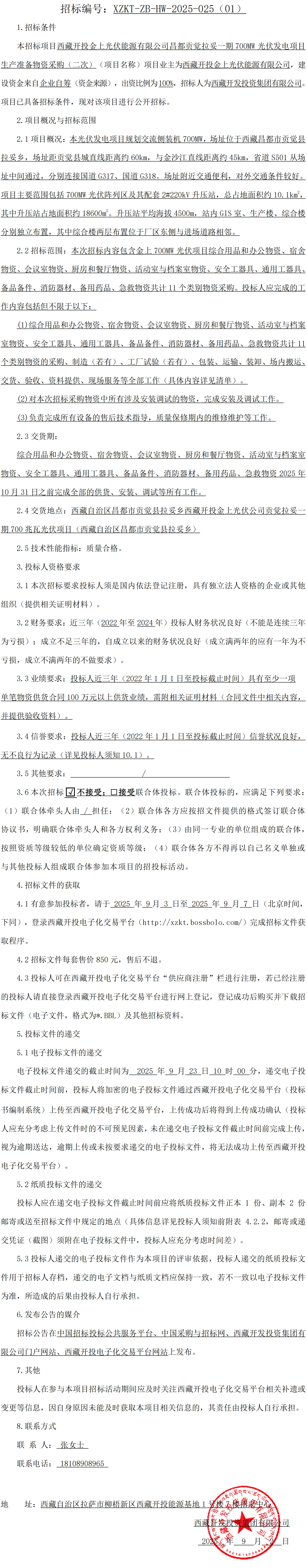 西藏開投金上光伏能源有限公司昌都貢覺拉妥一期 700MW 光伏發(fā)電項(xiàng)目生產(chǎn)準(zhǔn)備物資采購(二次)招標(biāo)公告