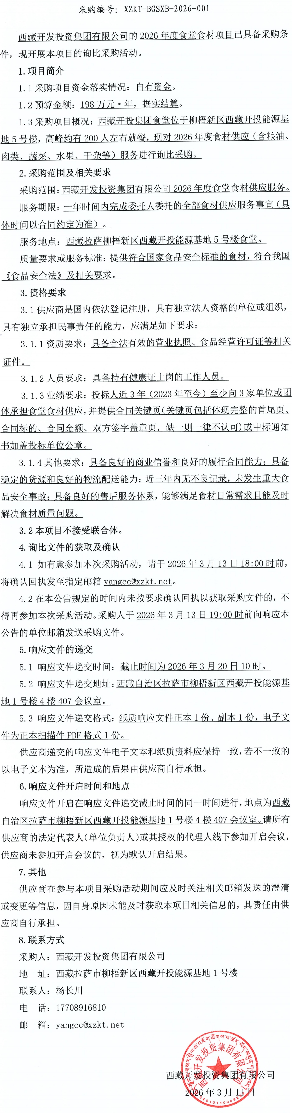 西藏開發(fā)投資集團有限公司2026年度食堂食材詢比采購公告